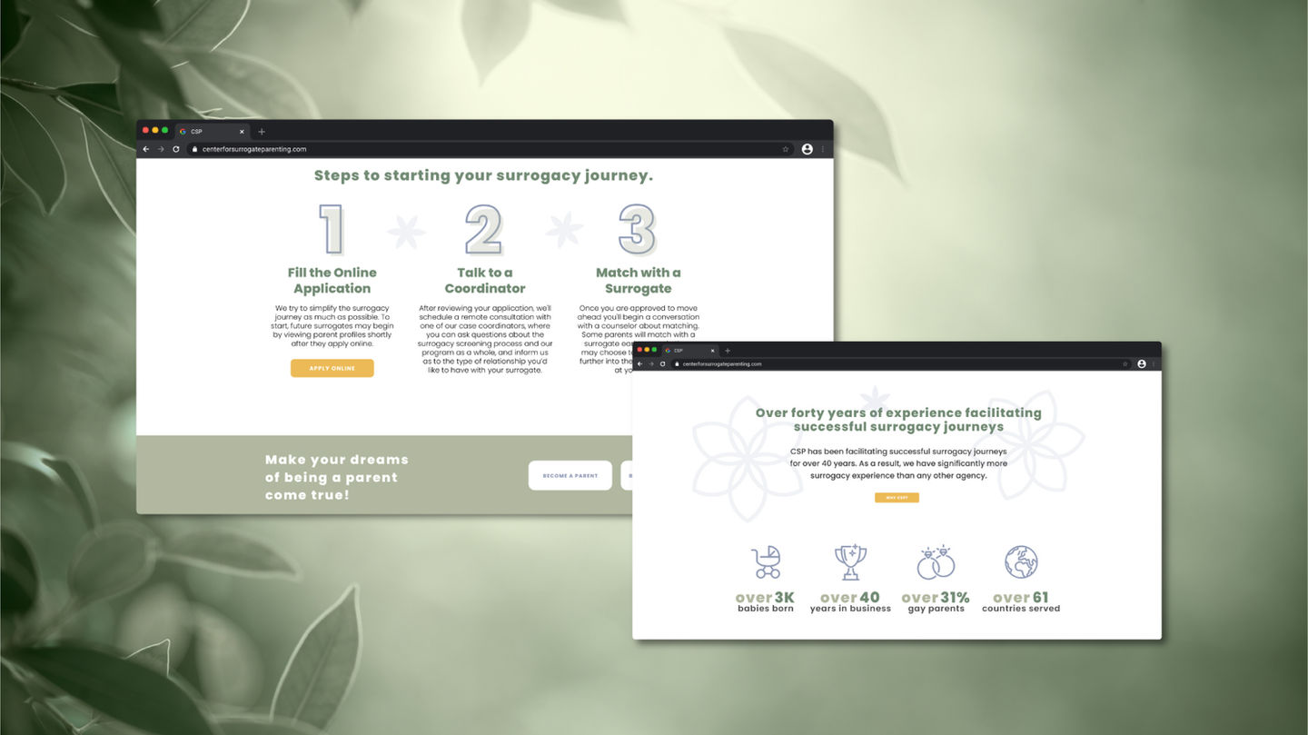 The Center for Surrogate Parenting website redesign showcases my ability to craft meaningful digital experiences from the ground up. I guided our designer through key parts of the rebranding process and led the full web design effort to create a platform that exceeded expectations. The result is a fresh, user-friendly site that reflects the organization’s care, professionalism, and mission.